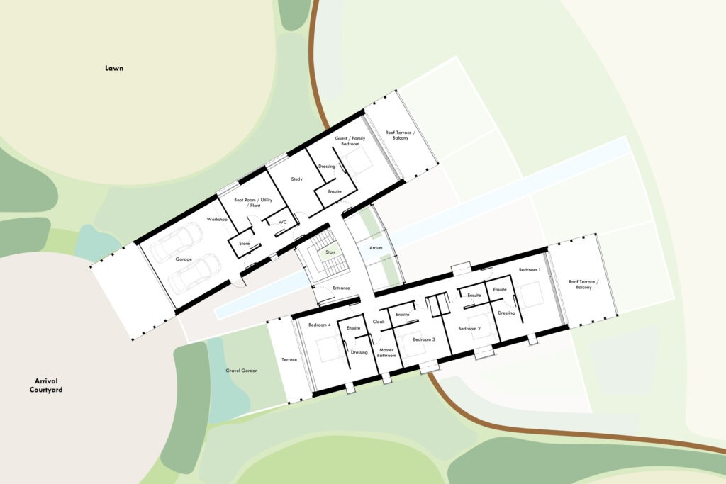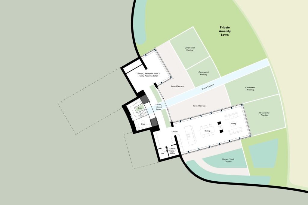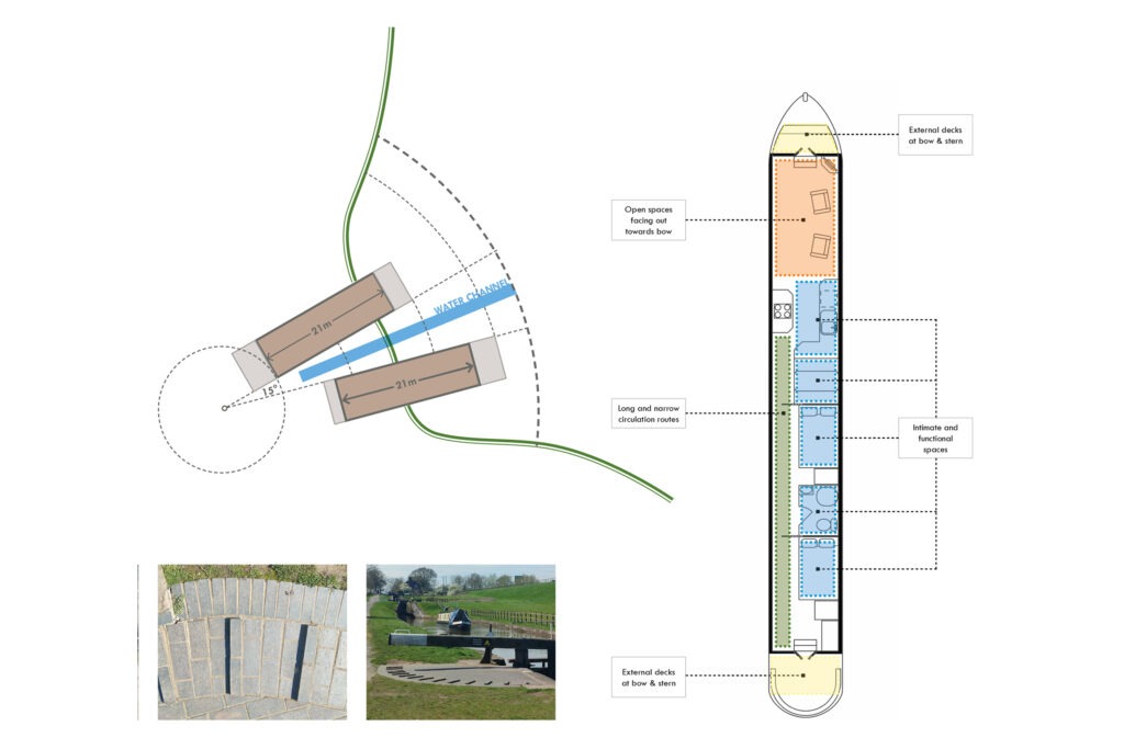 The concept draws deeply from the site’s immediate context. A landscape defined by water, movement, and engineered precision. The canal network, with its rhythmic sequence of bridges, locks, and moorings, provides both the formal and experiential inspiration for the dwelling. Our design seeks to reinterpret these linear and channelled geometries in architectural form, creating a home that feels simultaneously anchored in its setting and in dialogue with the quiet motion of the canal.