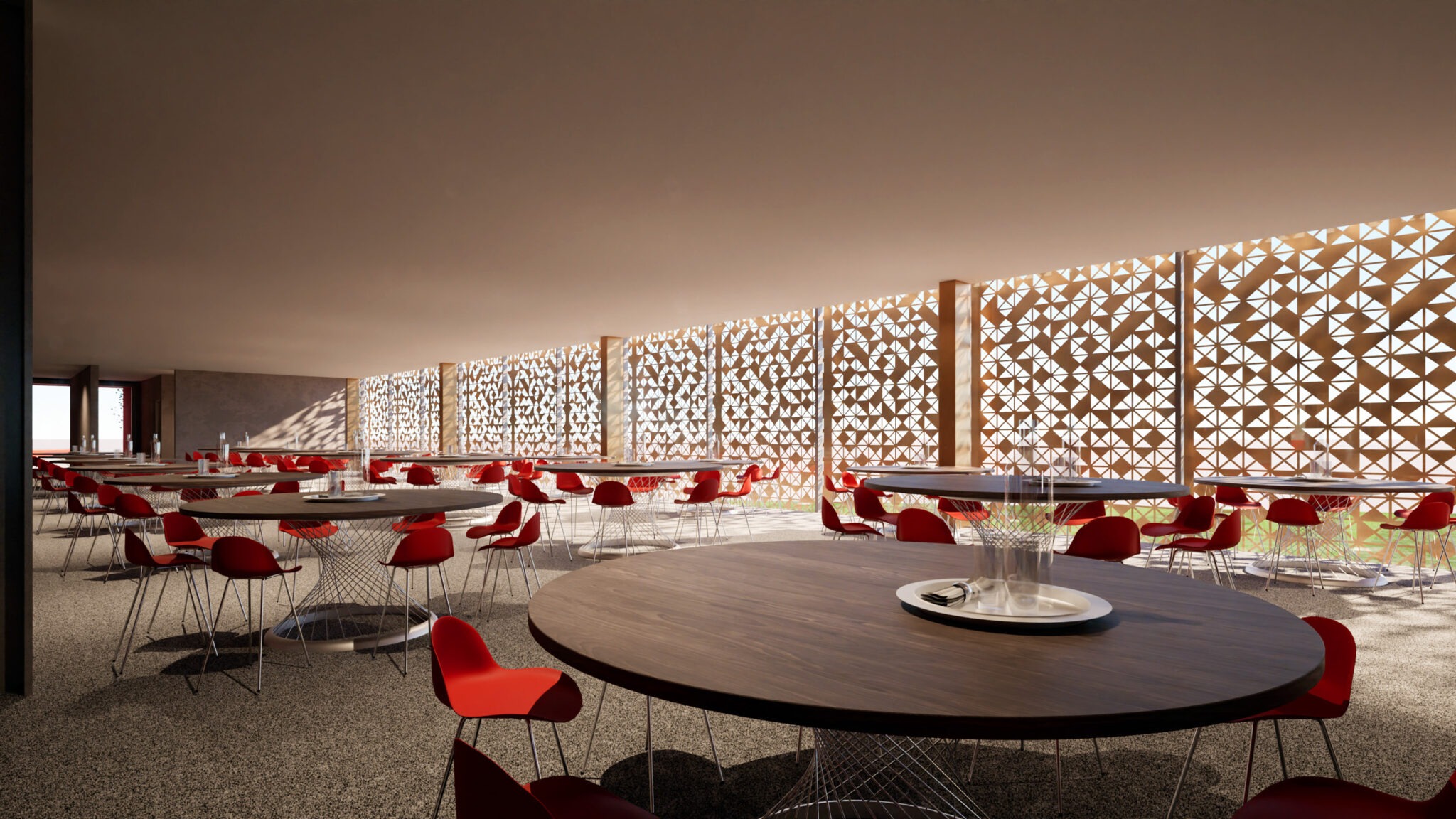 Externally, we proposed a glazed façade with a laser cut metal cladding sun screen to the first and second floors. The laser cut pattern within the cladding is inspired by the retained tree foliage either side. From the Swindon Town FC colour palette we have selected gold as the cladding colour and this will help identify the new venue as a place of quality and competitive success.